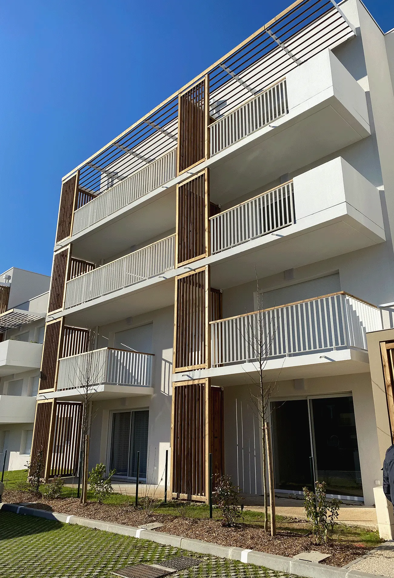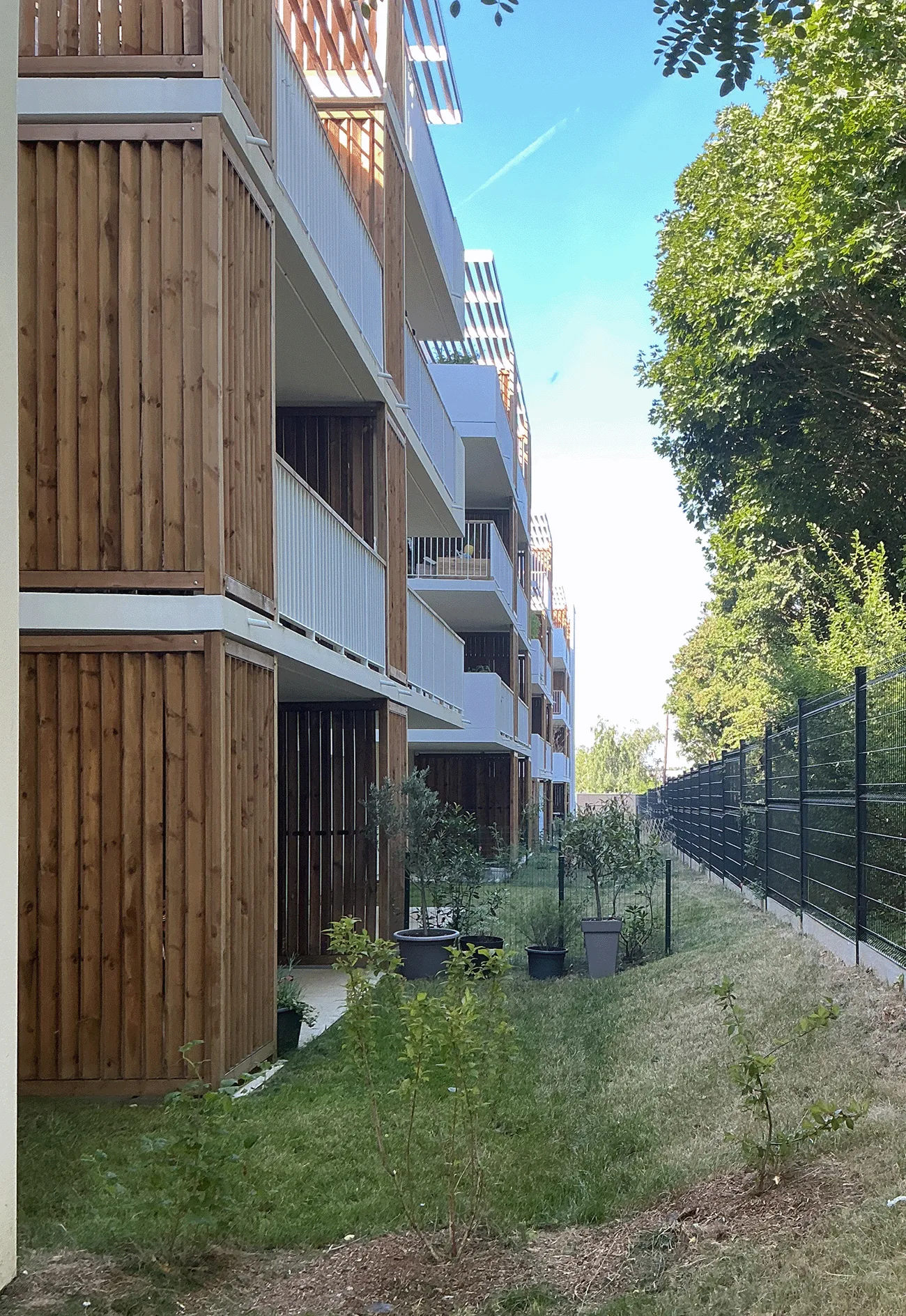 Les logements, du T1 au T4, bénéficient tous de terrasses avec jardins privatifs, de balcons ou loggias généreuses, intégrant des séchoirs et des éléments bois participant au rythme des façades. Les halls, locaux vélos, stationnements et espaces partagés ont été conçus pour favoriser les usages quotidiens, les mobilités douces et la convivialité.