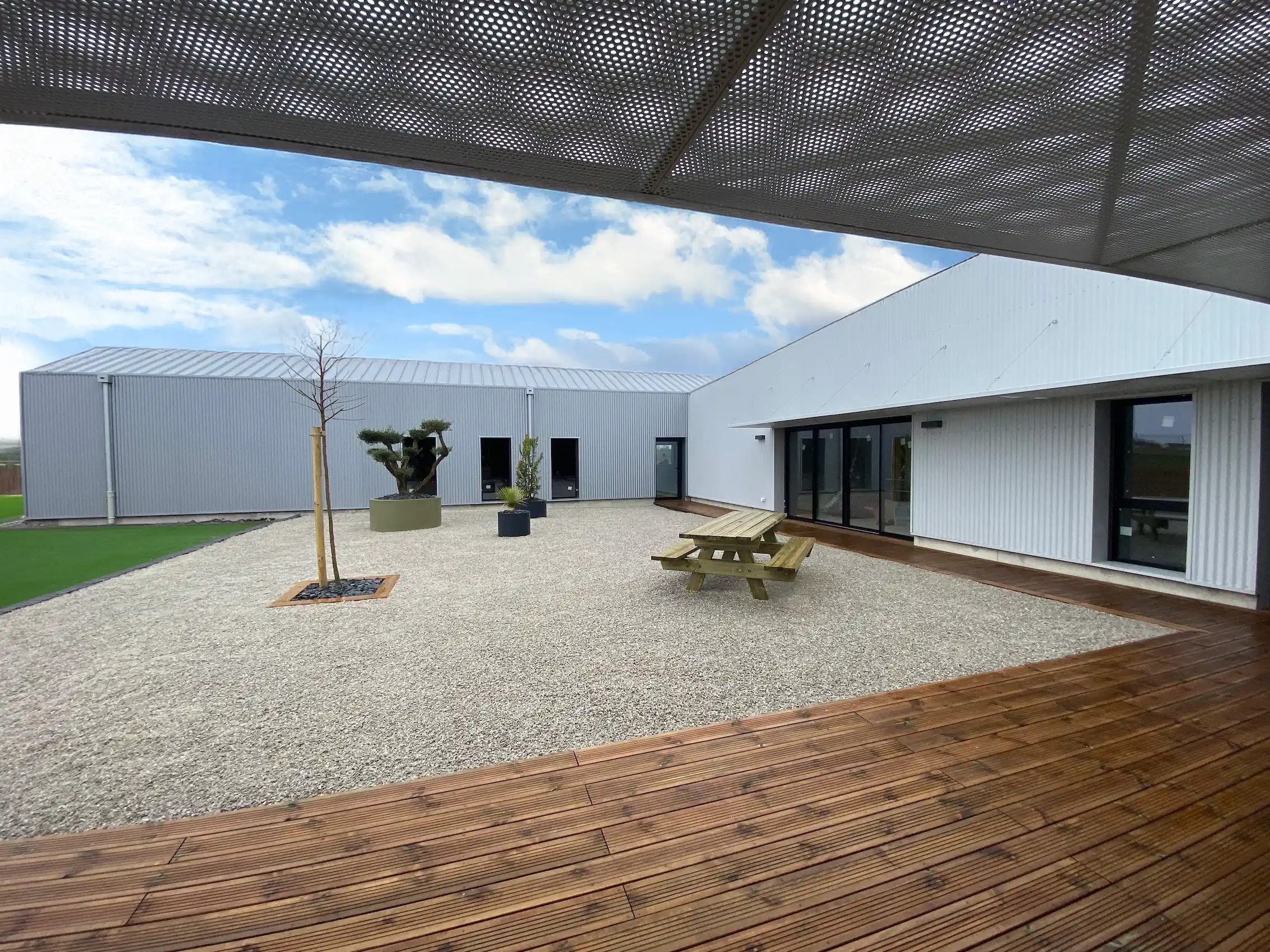 L’architecture est simple et cohérente, avec des toitures à double pente et des façades en bardage métallique clair. Les aménagements extérieurs privilégient l’accessibilité, le confort d’usage et la gestion des eaux pluviales par infiltration.