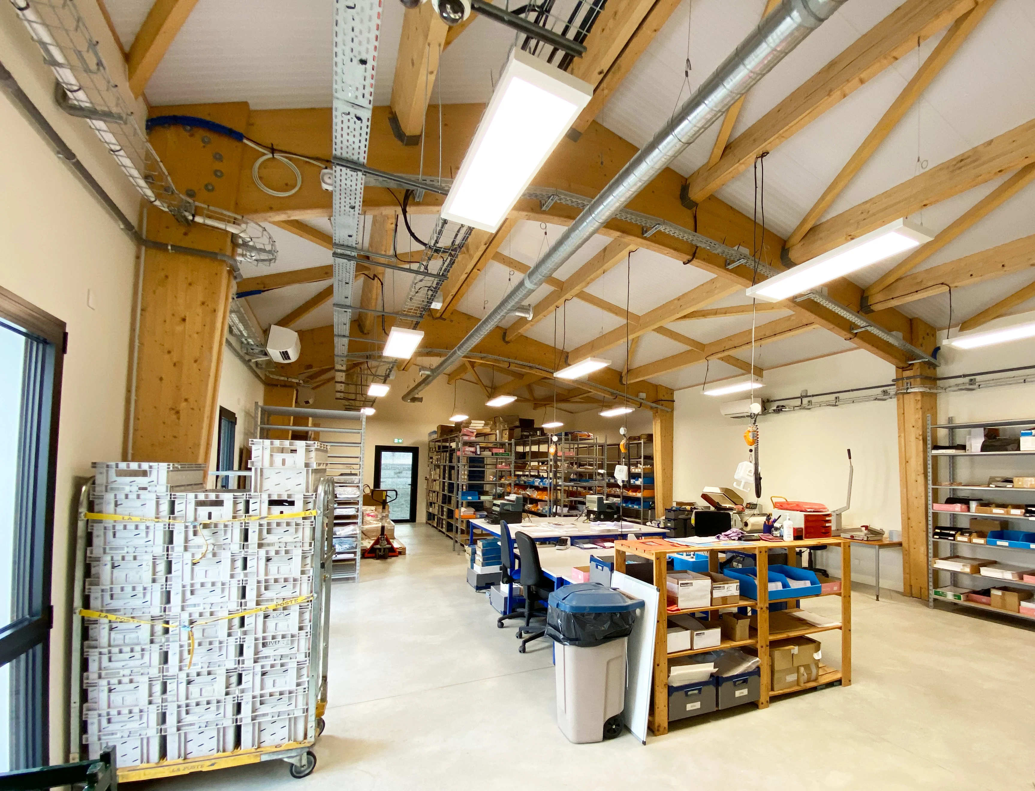 Le bâtiment de plain-pied s’organise entre un parking au nord et un espace paysager au sud. Il se compose d’un volume atelier avec porche de livraison et d’un ensemble de bureaux en L tourné vers un patio paysagé.