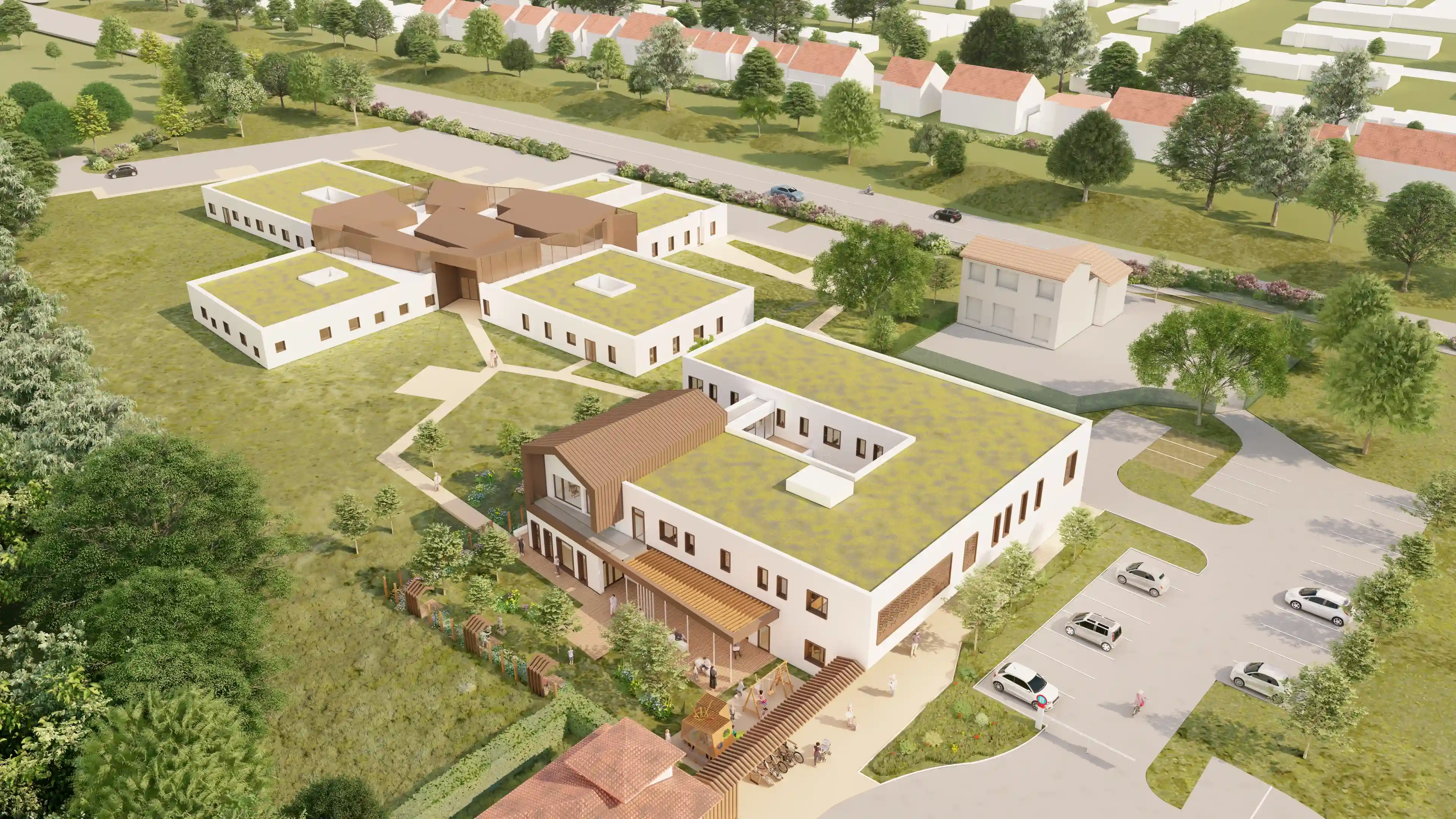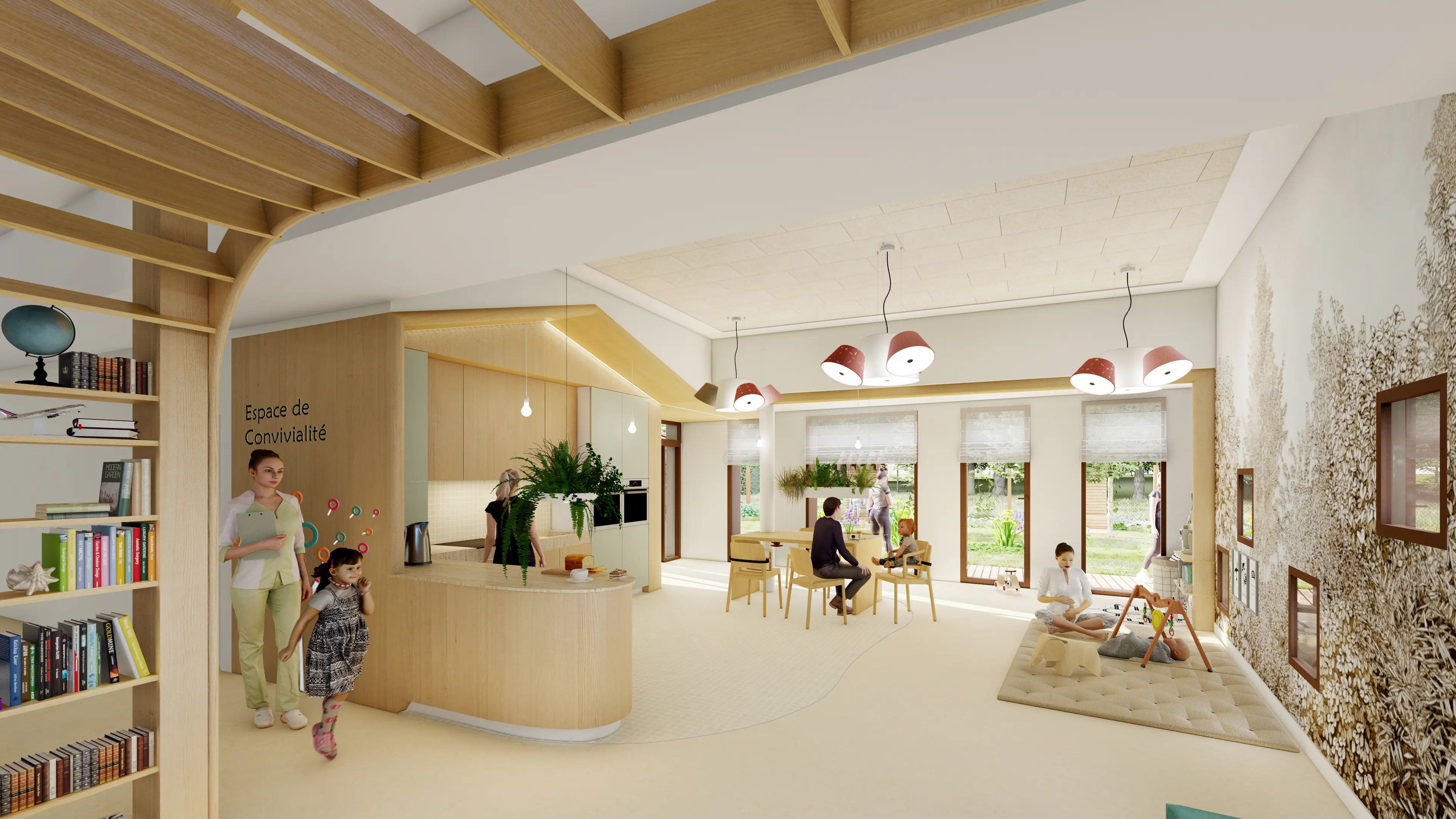 L’architecture sobre et discrète privilégie des matériaux durables et doux — enduit, zinc et bois en aménagement intérieur — pour créer une atmosphère protectrice et bienveillante, pensée comme un véritable lieu de vie au service des patients et des soignants.