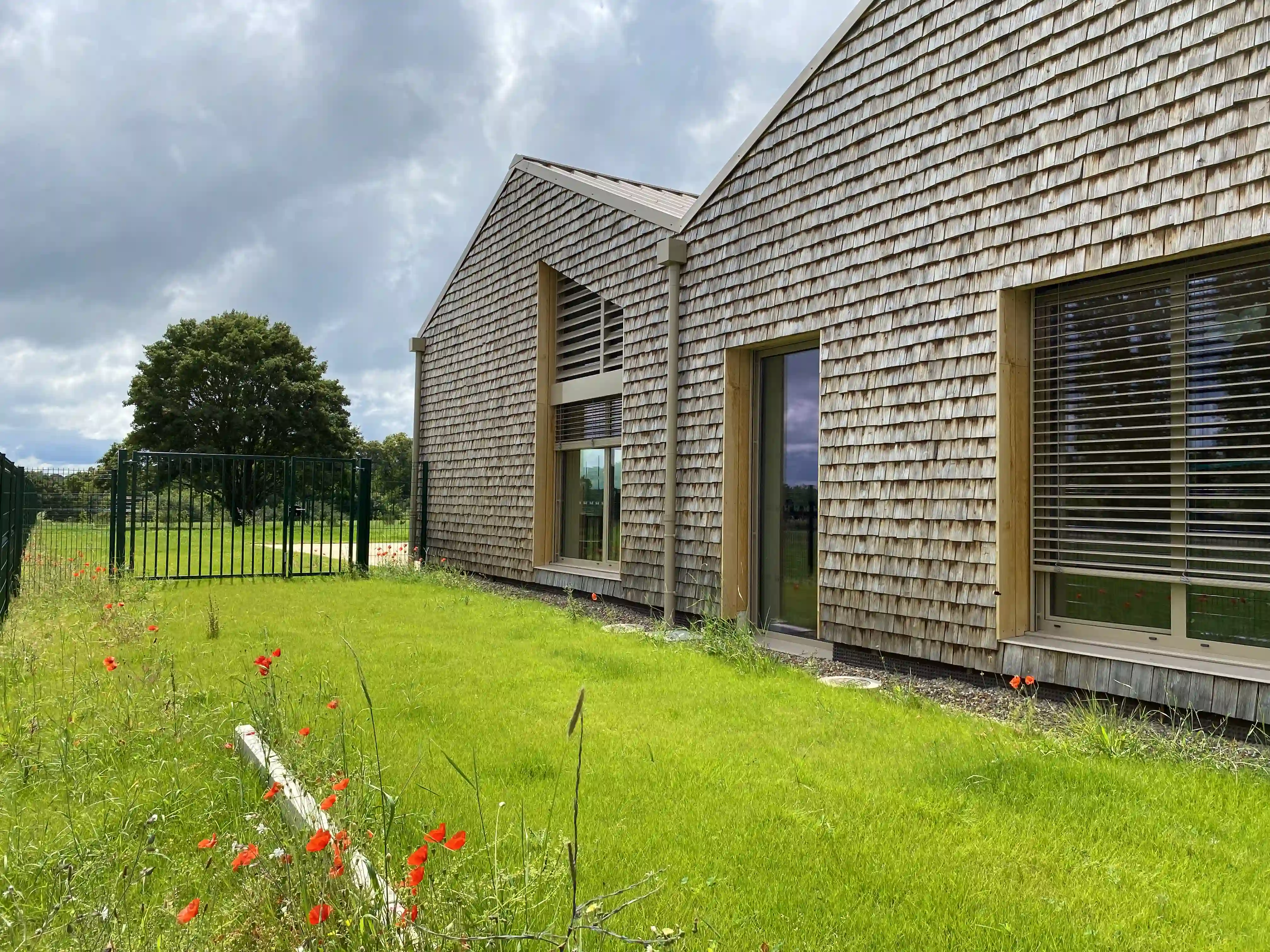 La volonté de construire de manière durable s’est matérialisée par l’utilisation de matériaux locaux et biosourcés. L’isolation est faite en bottes de paille (matériau écologique à forte performance thermique). Les façades et une partie des toitures sont revêtues de bardeaux en châtaignier (bois local résistant aux intempéries, choisi pour sa durabilité et son esthétique chaleureuse).