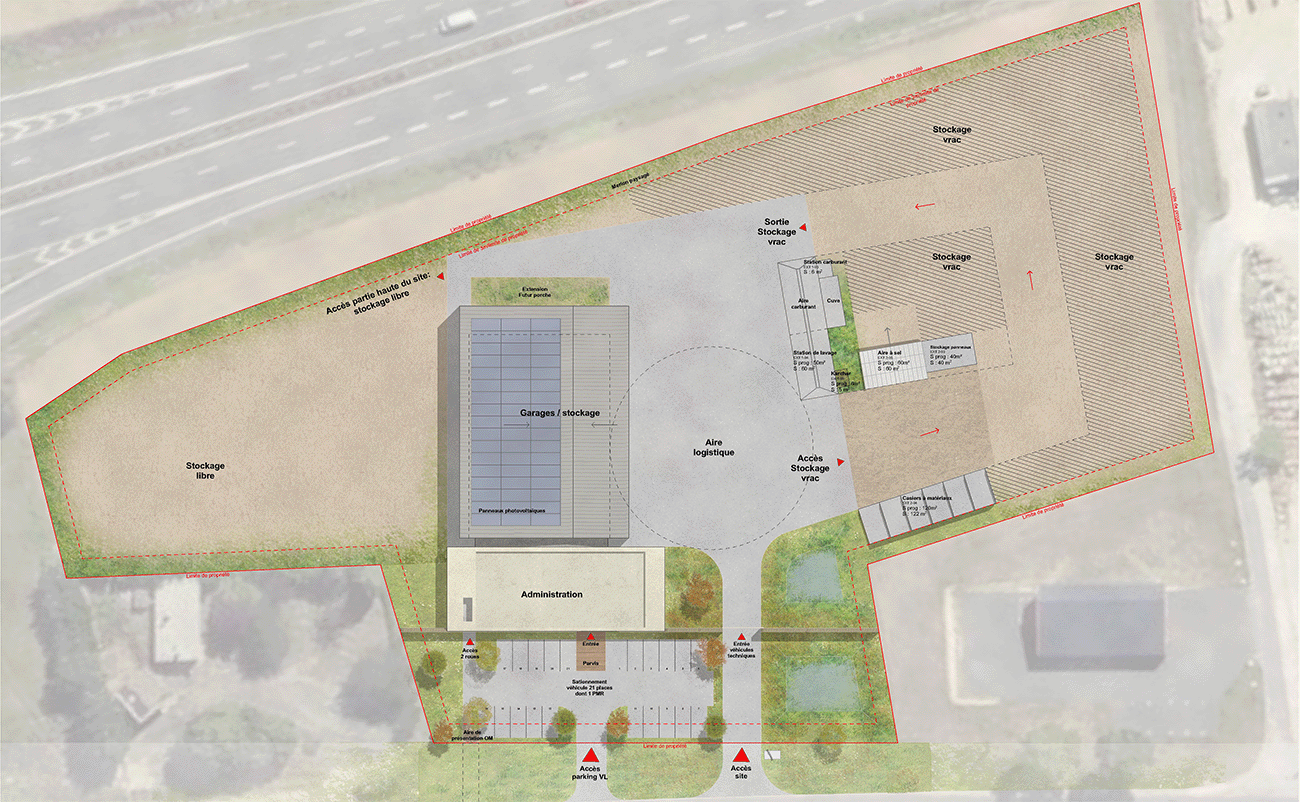 Le projet du centre routier départemental de Fontclaireau propose un équipement fonctionnel et durable, conçu autour du principe de la marche en avant de l’agent, garantissant des circulations claires et efficaces.