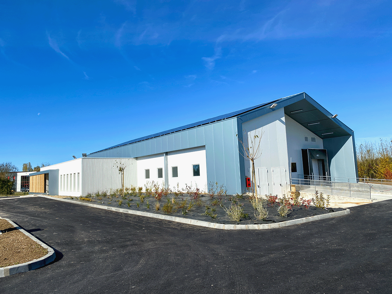 L’aménagement extérieur intègre des stationnements pour véhicules légers et utilitaires, un local de présentation des déchets en limite de parcelle et une noue paysagère en fond de terrain pour la gestion des eaux pluviales. L’ensemble compose un équipement fonctionnel et durable, au service des circuits courts et de l’économie locale.