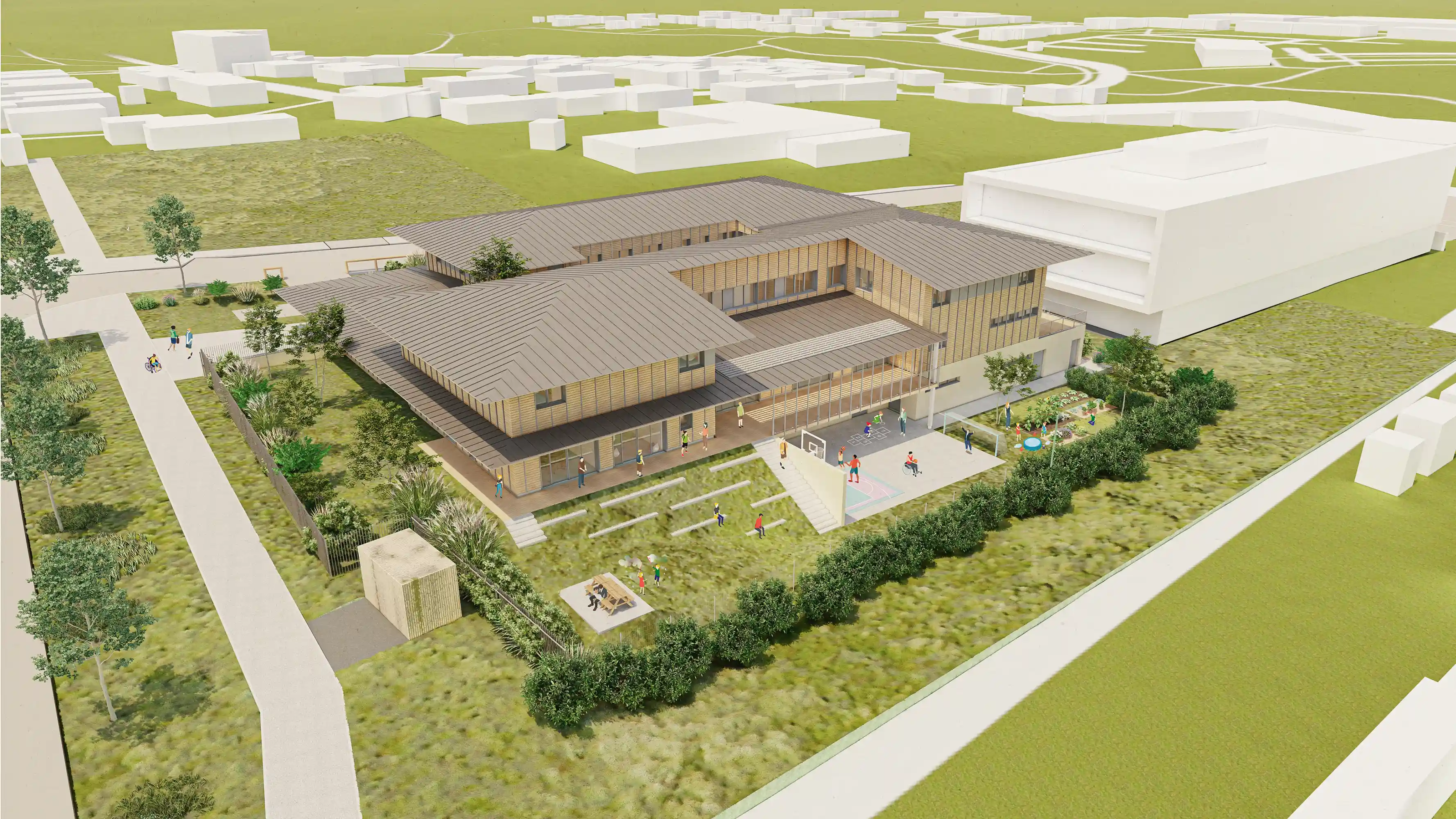 L’organisation fonctionnelle est structurée par niveaux : locaux techniques et logistiques en sous-sol, espaces d’accueil et de vie en rez-de-chaussée, consultations et unités de nuit à l’étage, garantissant confidentialité, lisibilité des usages et séparation des flux. Les espaces d’hospitalisation s’ouvrent largement sur des jardins protégés, offrant des ambiances variées entre activités calmes et espaces de jeux.