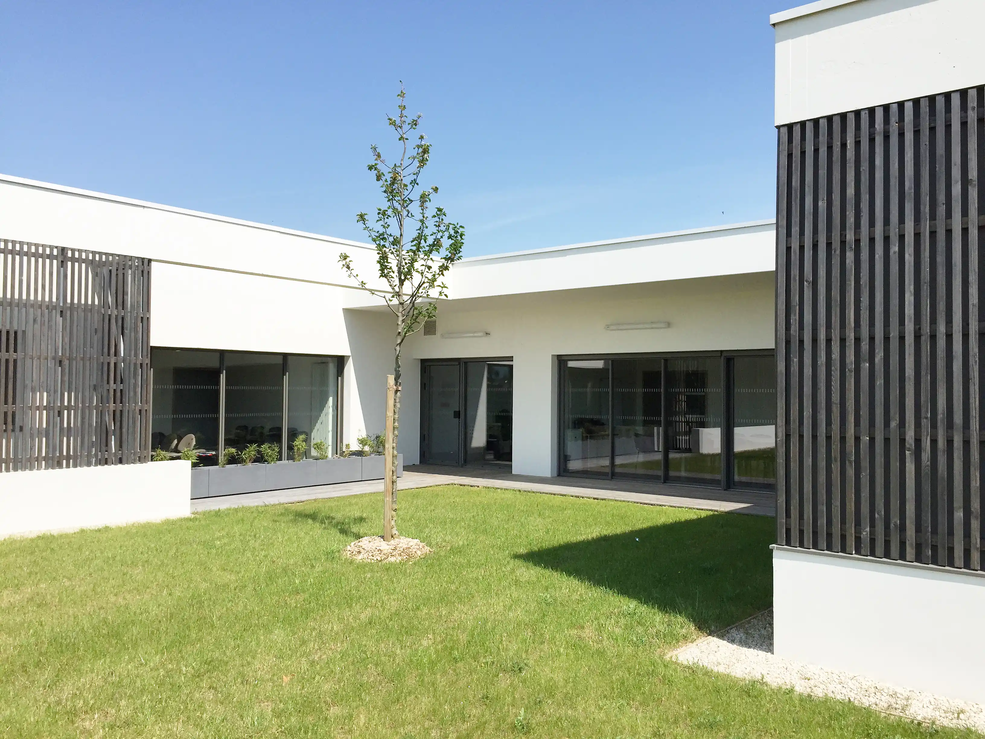 L’architecture contemporaine, sobre et identifiable, reprend les codes du site hospitalier voisin. L’implantation et l’orientation du projet optimisent les apports solaires naturels, tandis que des dispositifs de protection limitent les surchauffes estivales et préservent l’intimité des usagers.