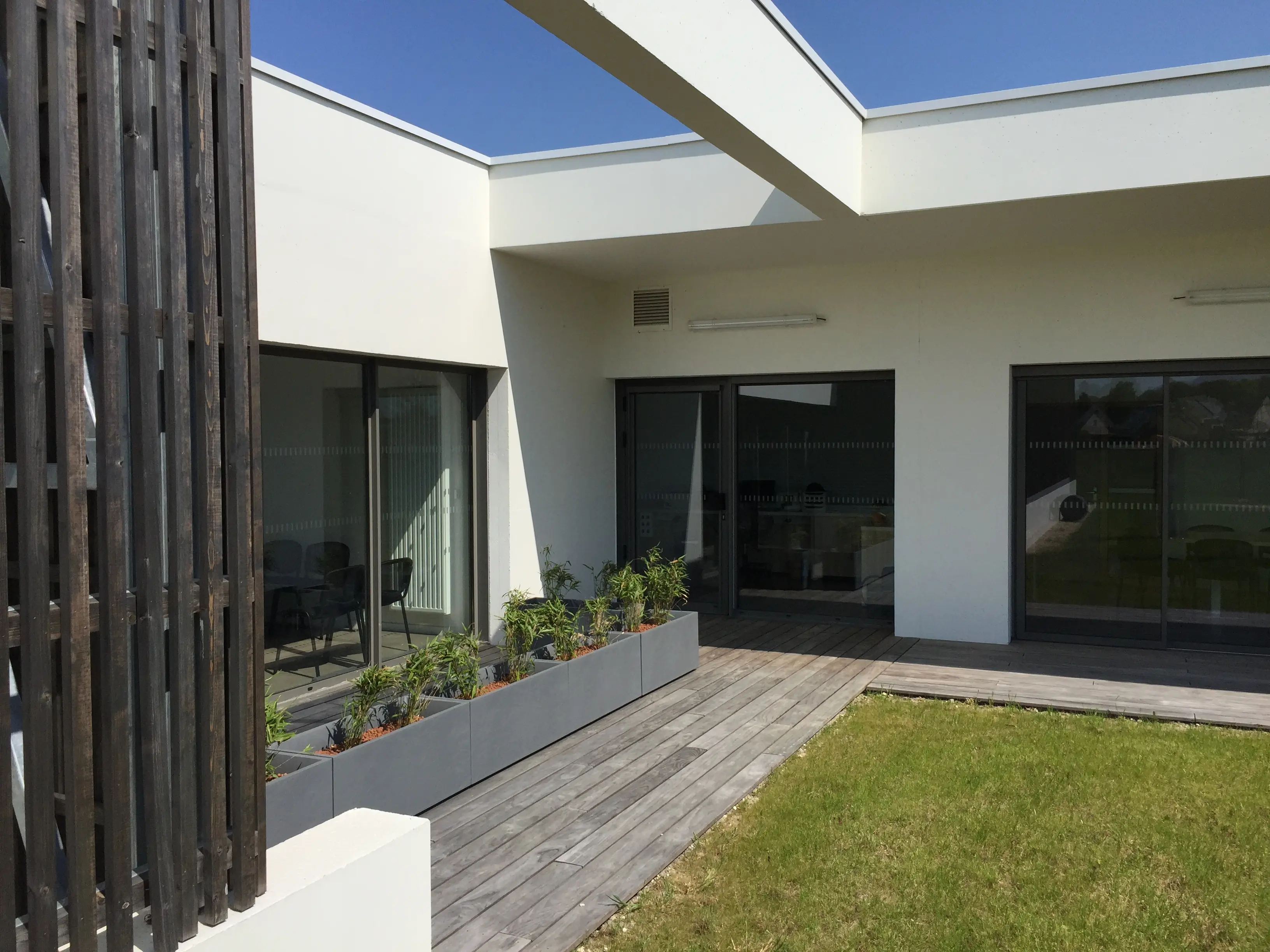 Pensé selon des principes de performance environnementale renforcée, le projet intègre une forte inertie thermique, une excellente étanchéité à l’air et une toiture terrasse végétalisée, visible depuis l’avenue principale, contribuant à l’insertion paysagère et à la gestion des eaux pluviales.