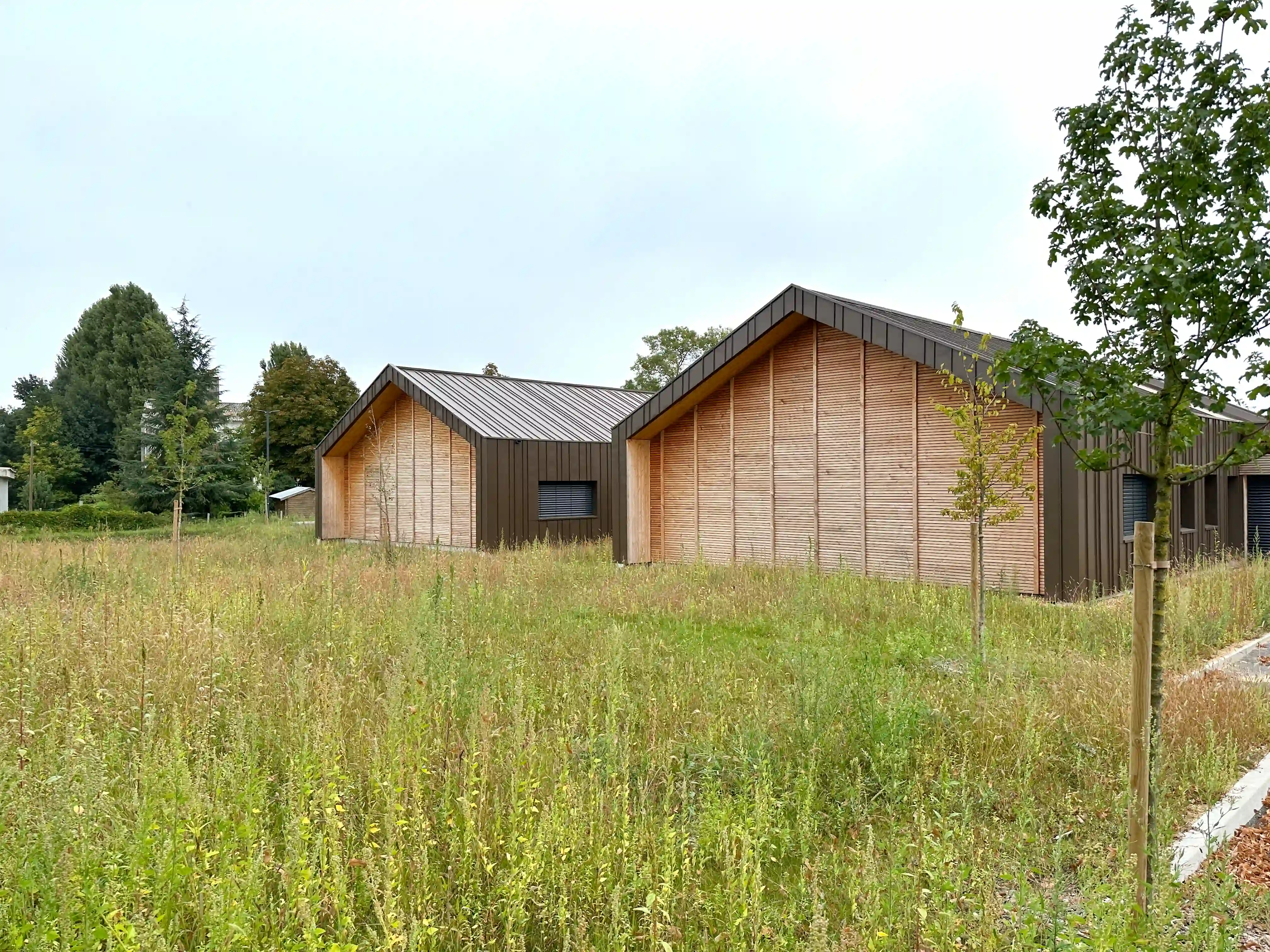 Conçue selon une approche bas carbone et bioclimatique, la construction repose sur une ossature bois, une isolation en paille et fibre de bois, et des équipements performants (géothermie, ventilation double flux, protections solaires). L’architecture contemporaine, inspirée de formes traditionnelles, s’accompagne d’un traitement paysager qualitatif, favorisant le confort des usagers et l’intégration du projet dans son environnement.