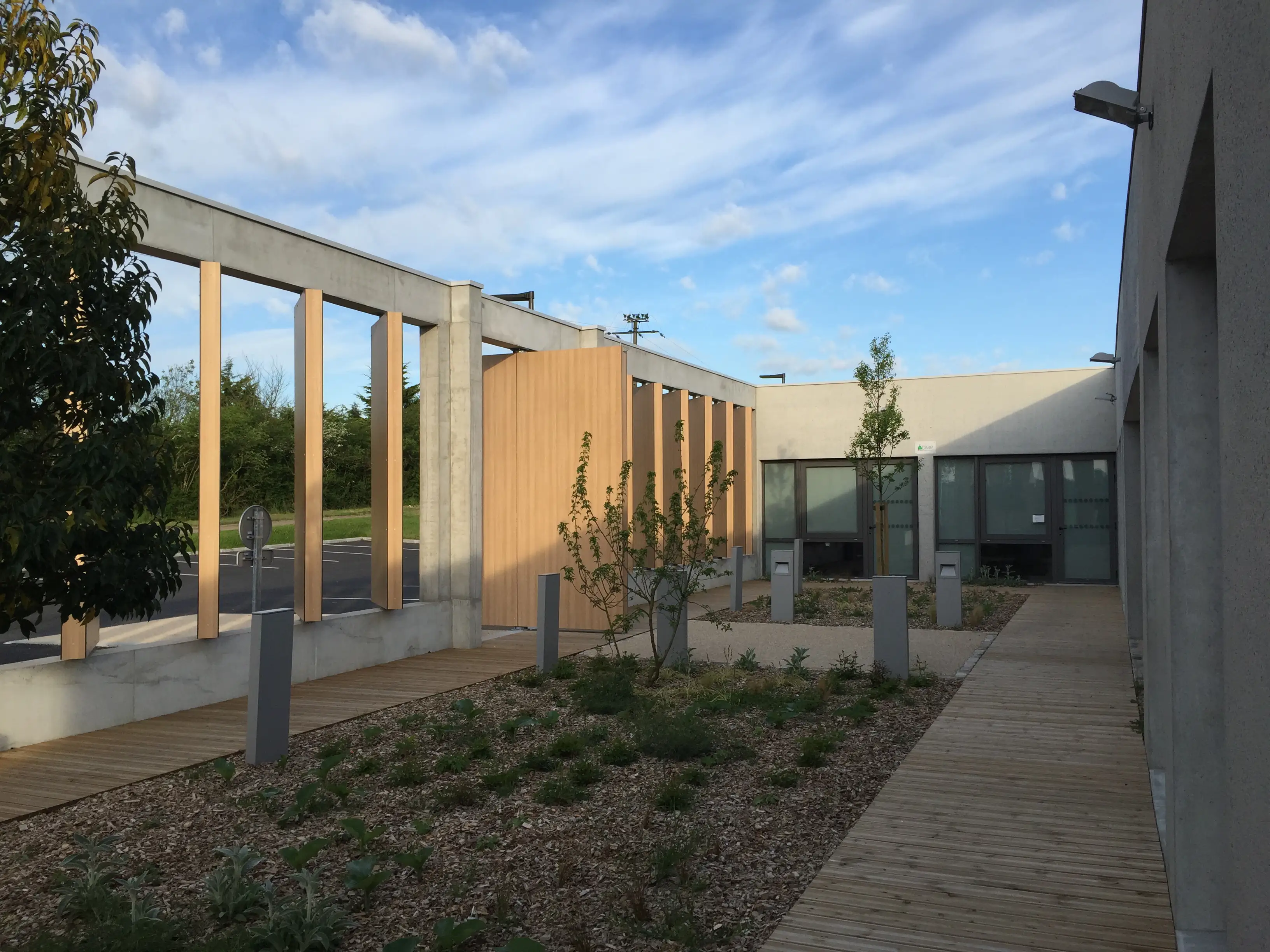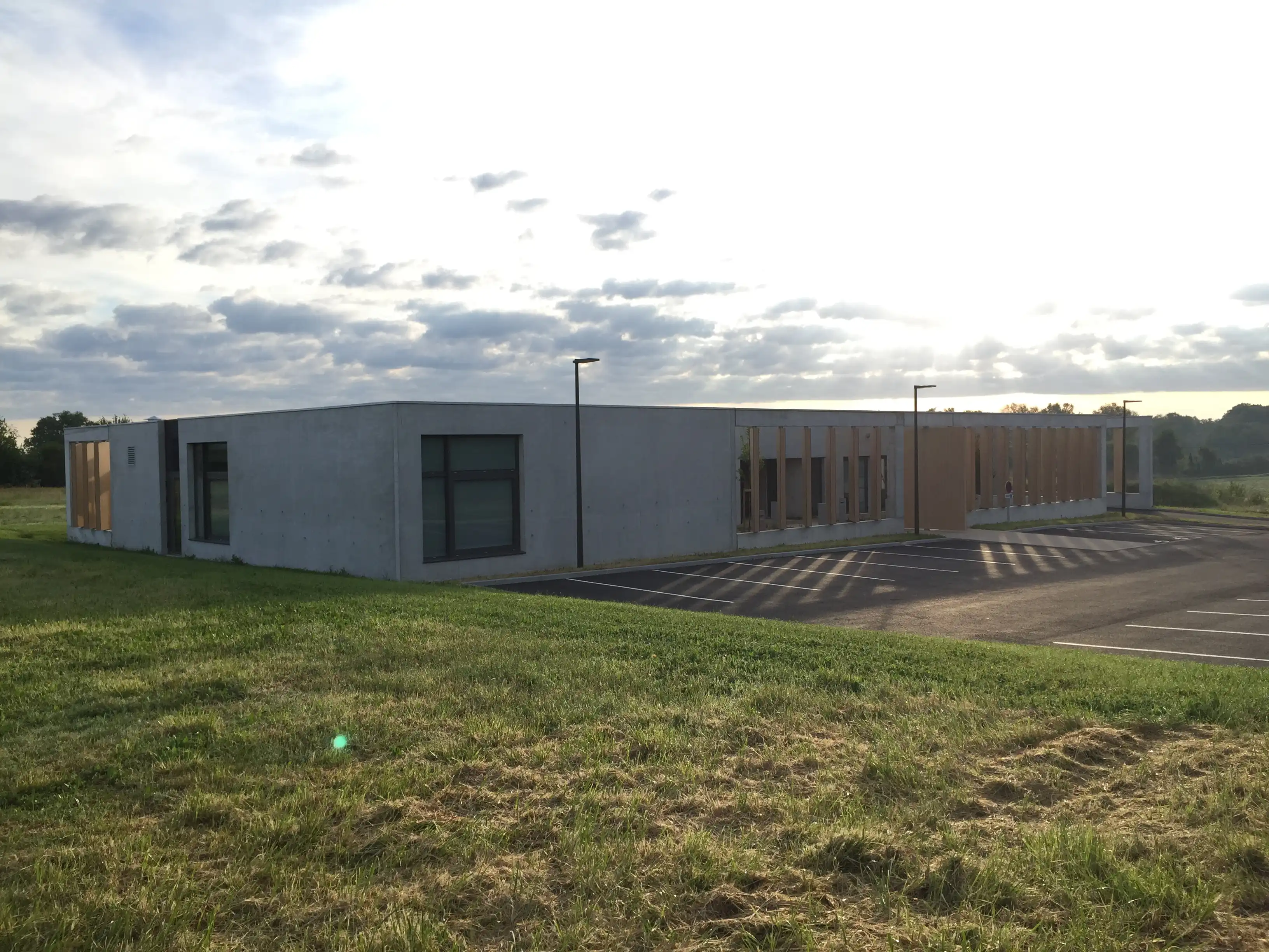 Les abords sont aménagés pour favoriser l’accessibilité et l’usage quotidien du site, avec un parking de 27 places, des cheminements piétons qualitatifs et des espaces végétalisés. L’ensemble compose un équipement lisible, accueillant et durable, au service des habitants et des acteurs sociaux du territoire.
