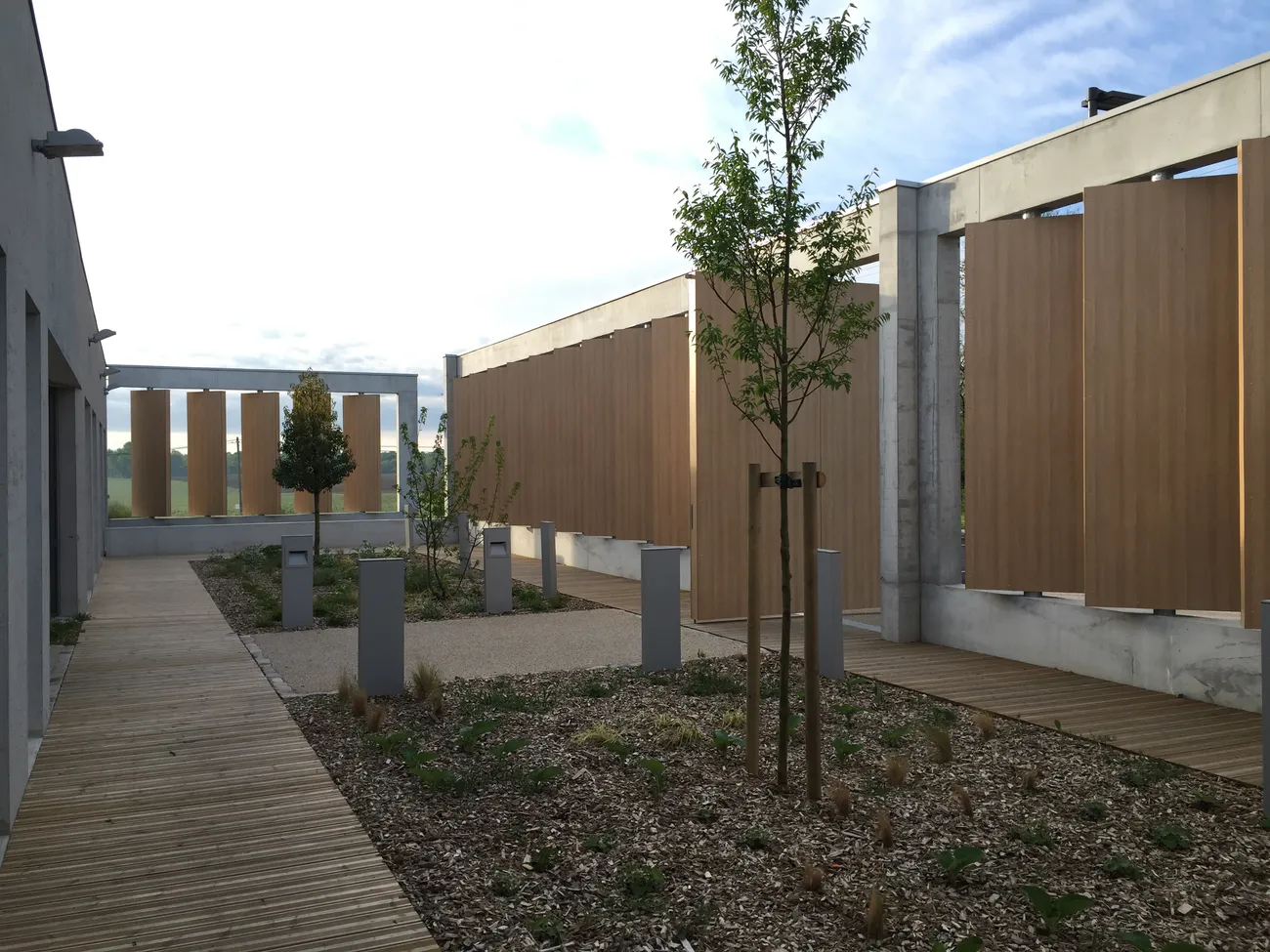 L’architecture, volontairement sobre et compacte, s’appuie sur un volume rectangulaire en béton brut, ponctué de trois patios paysagers : un patio d’entrée commun, une terrasse dédiée au personnel et un patio associé à la salle de réunion. Des brise-vues en bois assurent la confidentialité tout en structurant les espaces extérieurs.