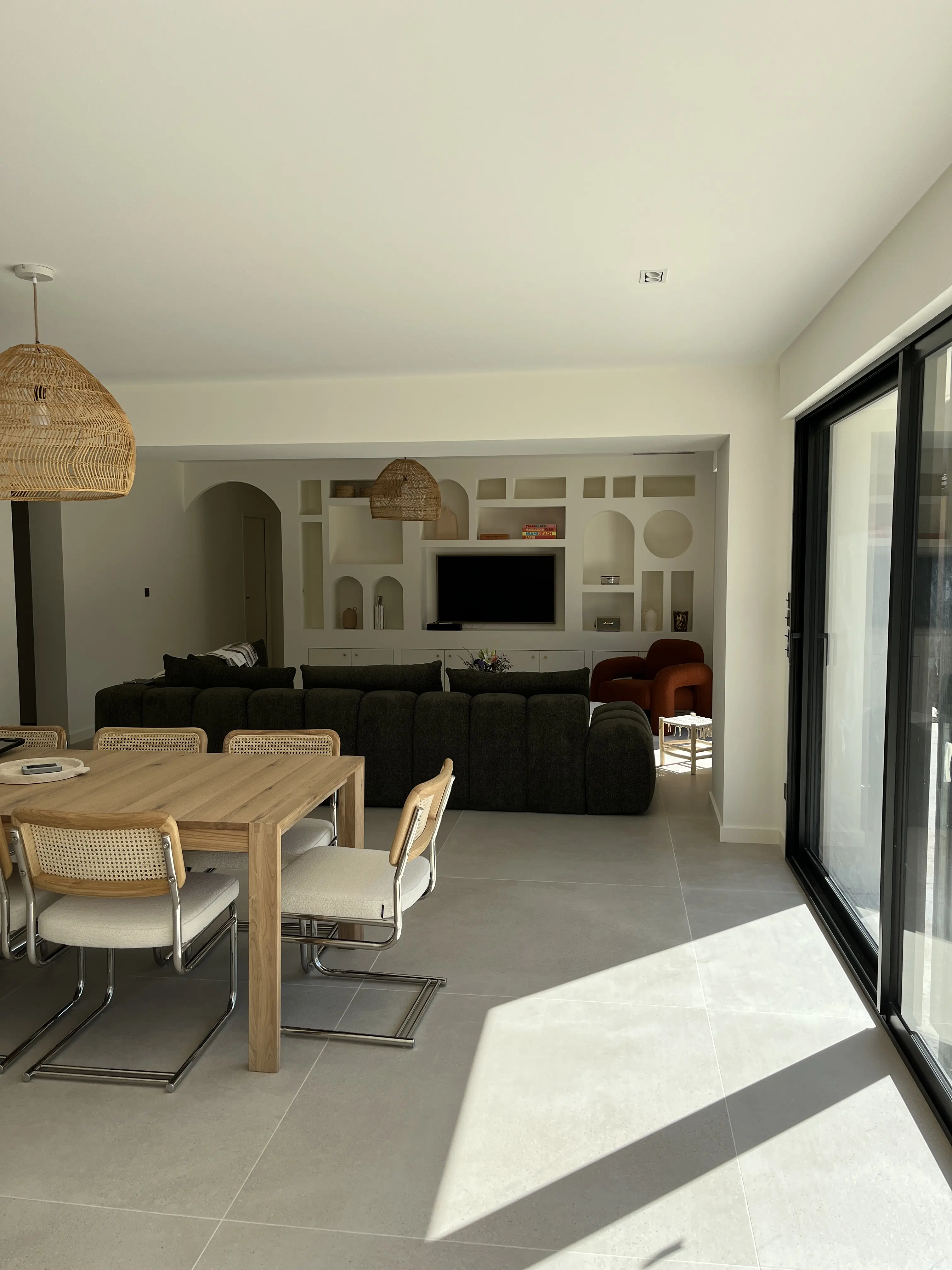 Les extensions reprennent les volumes et matériaux de la maison existante tout en affirmant une écriture contemporaine : maçonnerie enduite, parements en pierre naturelle, grandes ouvertures sur les jardins et toitures adaptées à chaque volume (toiture-terrasse ou tuiles). Des dispositifs de protection solaire, un patio et des aménagements annexes viennent compléter l’ensemble pour améliorer le confort, la lumière naturelle et la qualité de vie des occupants.