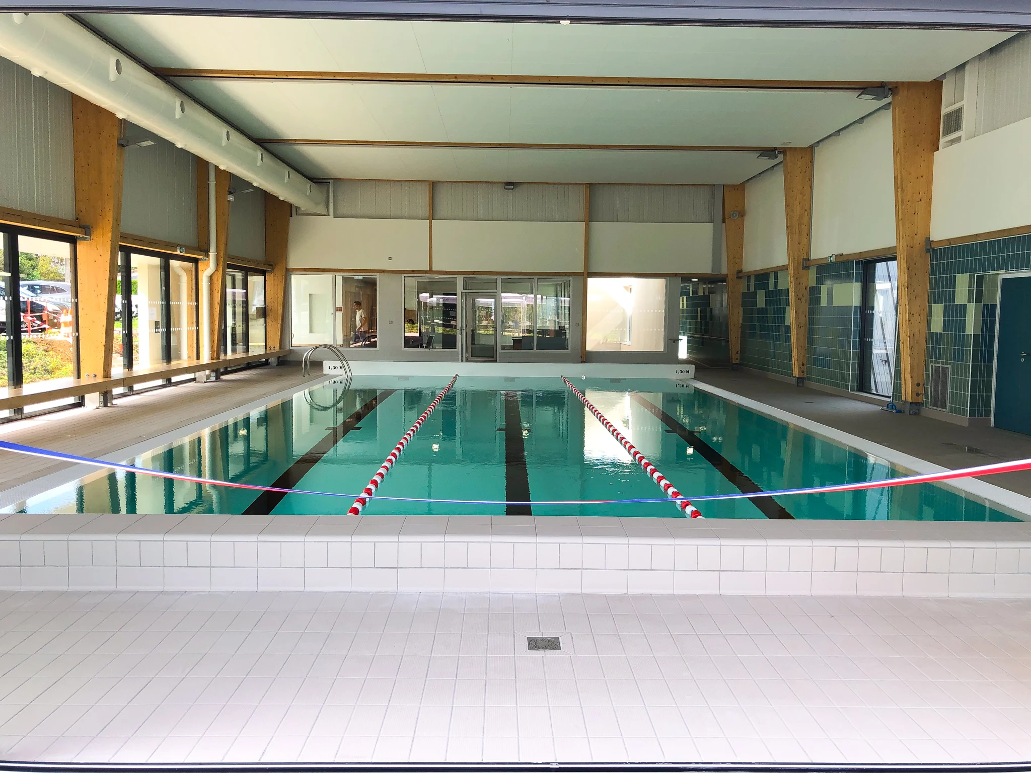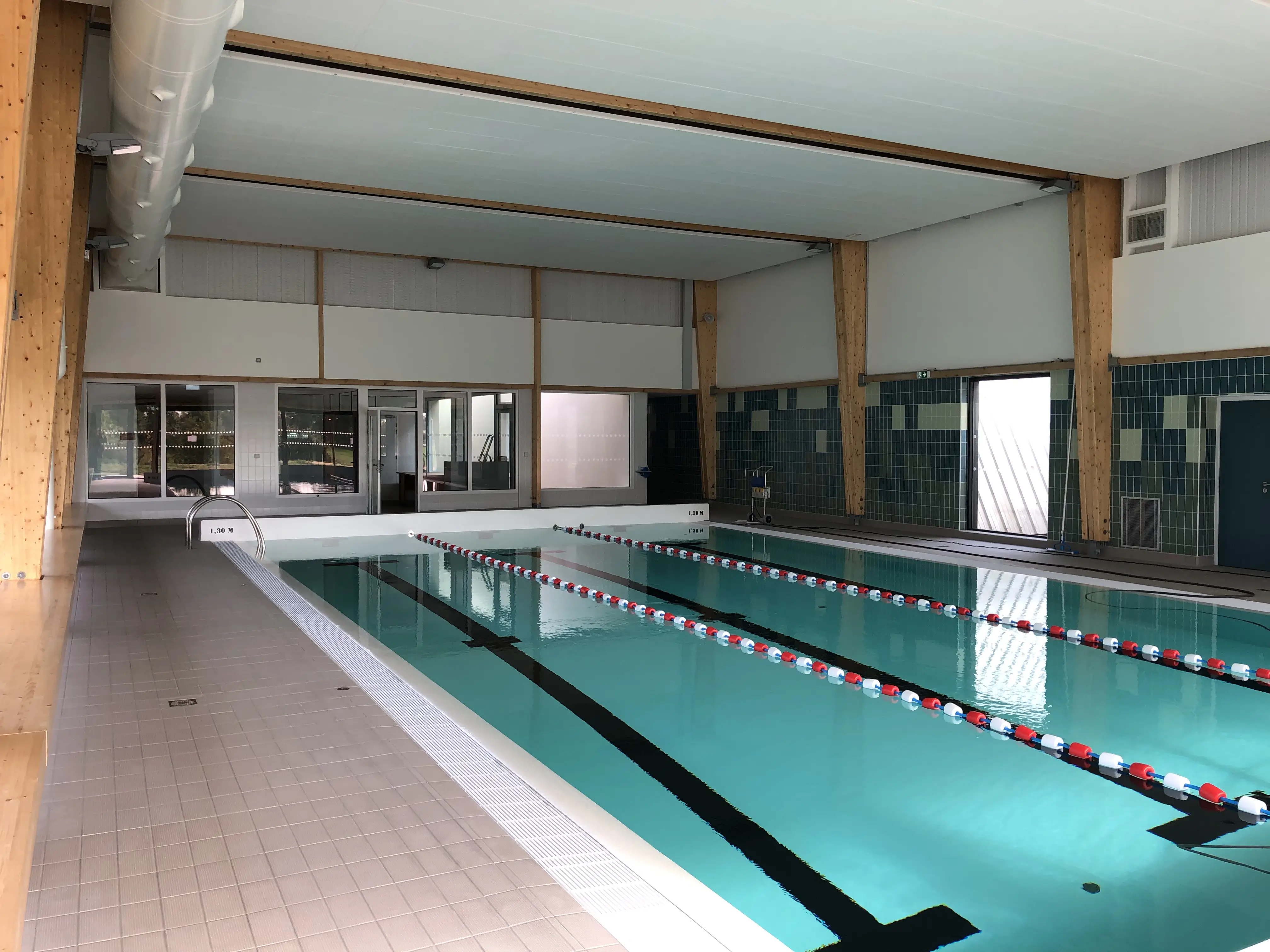 L’équipement s’organise autour de trois volumes distincts et lisibles : un volume bassin largement vitré, un volume vestiaires et un volume technique plus discret. Le parcours usager est fluide et intuitif, de l’accueil jusqu’au bassin, avec une liaison visuelle directe dès l’entrée.