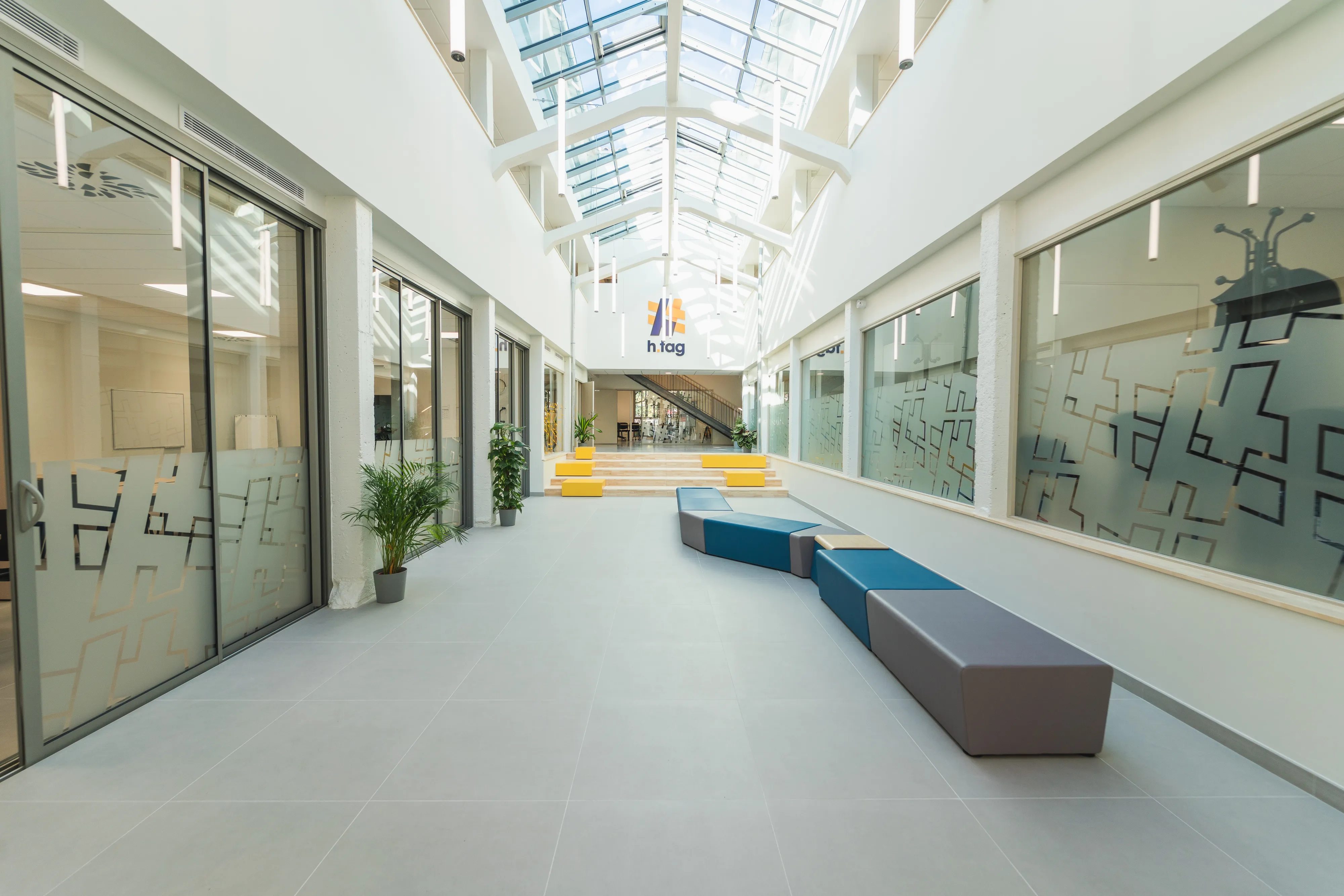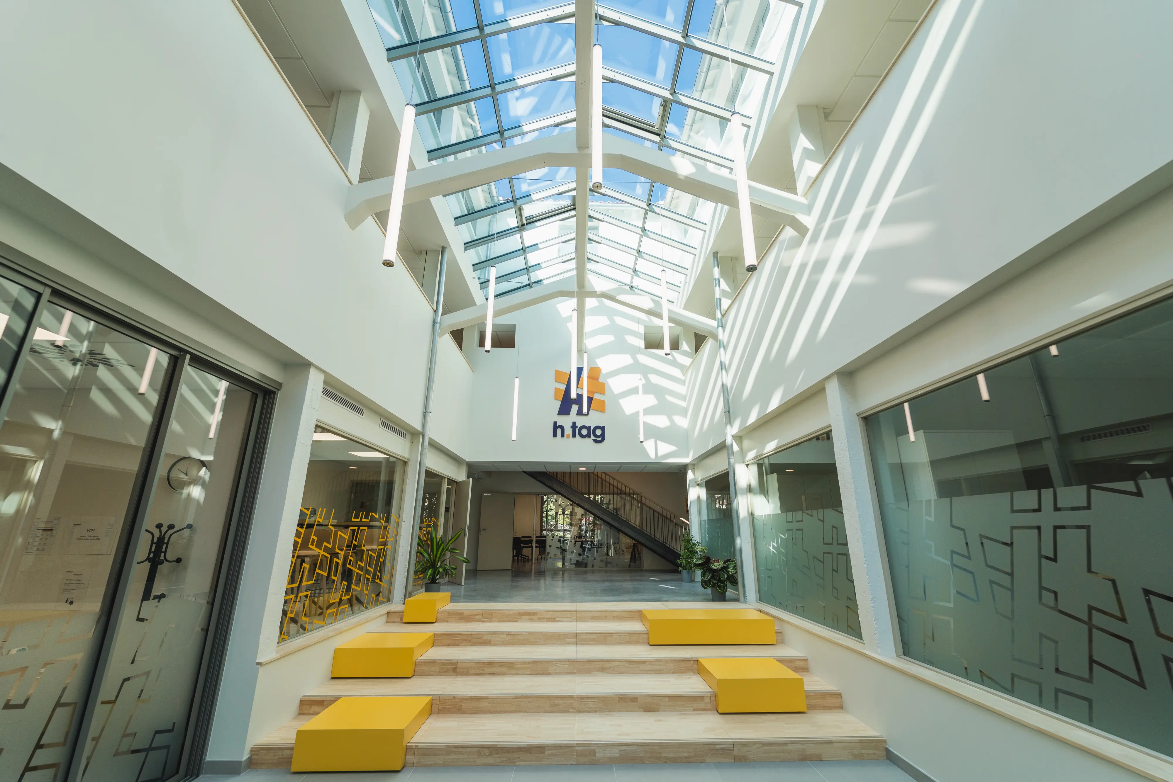 L’intervention valorise le bâti existant par une amélioration des performances énergétiques, un apport accru de lumière naturelle et une écriture architecturale sobre : façades enduites claires, menuiseries aluminium, verrière rehaussée à vitrage solaire.